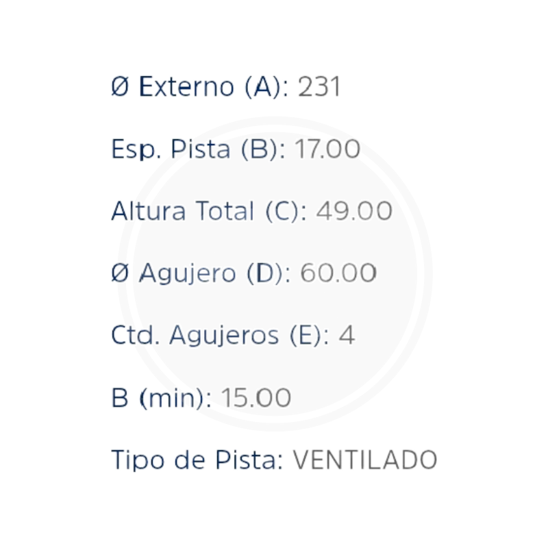 - Diámetro: [insertar tamaño en milímetros], Grosor: [insertar grosor en milímetros], Material: [insertar material utilizado en la fabricación], Ranuras de refrigeración: [insertar si cuenta con ranuras para mejor disipación de calor], Superficie anti corrosión: [insertar si tiene tratamiento anticorrosión]