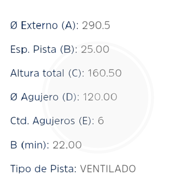 - {'Material': 'Fabricado en acero de alta calidad para resistir altas temperaturas y fricciones constantes.', 'Diseño': 'Diseñado para ajustarse perfectamente al sistema de frenado del vehículo, proporcionando una superficie de contacto eficiente.', 'Diámetro': 'Tamaño y espesor específicamente diseñados para las dimensiones del vehículo IVECO Turbo Daily 59-12.', 'Ranuras de ventilación': 'Presenta ranuras para la disipación efectiva del calor generado durante el frenado, evitando el sobrecalentamiento del disco.', 'Tratamiento térmico': 'Sometido a un tratamiento térmico para mejorar su resistencia al desgaste y aumentar su vida útil.'}