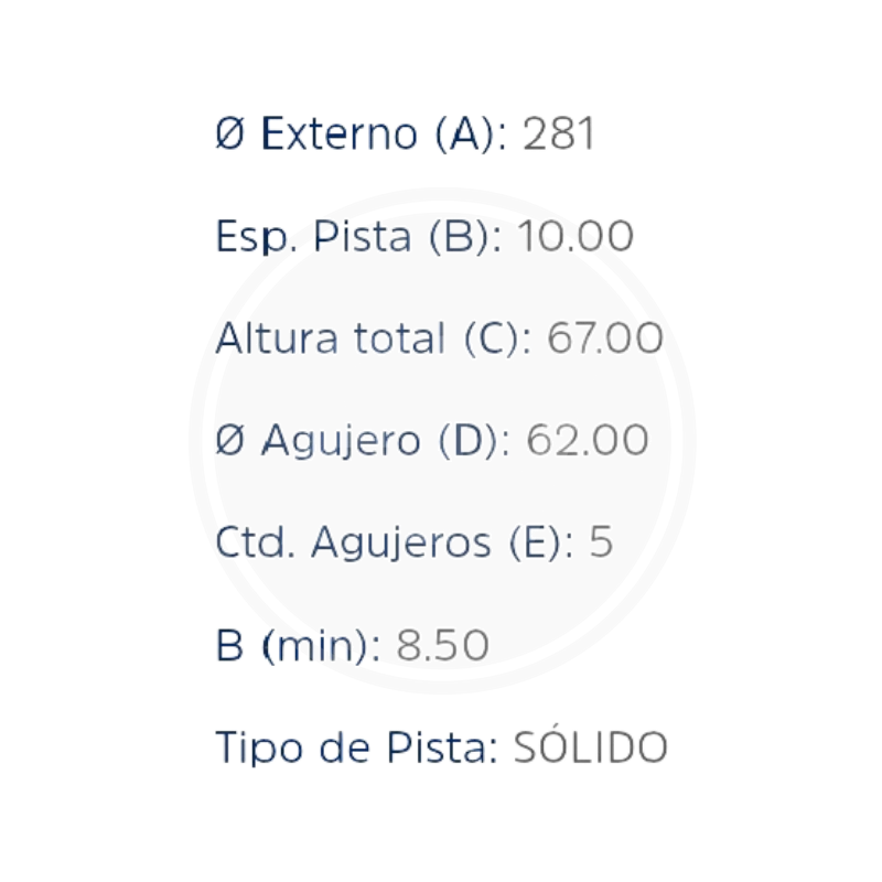 - Diámetro: XX mm, Espesor: XX mm, Material: Hierro fundido de alta resistencia, Ranuras y orificios de ventilación para una mejor disipación del calor, Superficie tratada para resistir la corrosión y el desgaste.