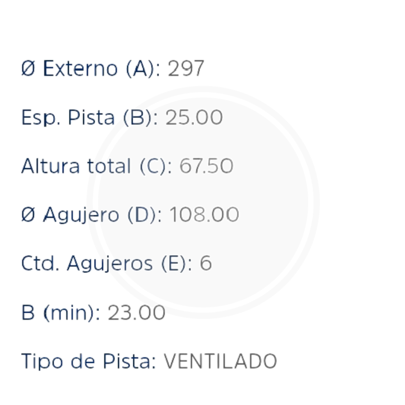 - Diámetro: 297mm, Grosor: 28mm, Altura: 49.5mm, Número de orificios: 6, Tipo de montaje: Centrado.